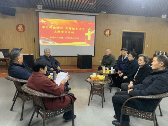 4月7日下午,在南校区师生活动中心教工活动室,离退休六支部举办“学习‘两会’精神,发挥银发活力”主题党日活动,支部书记朱龙英、支部在盐老党员周乾、陆文林、葛友华、朱效波等参加。