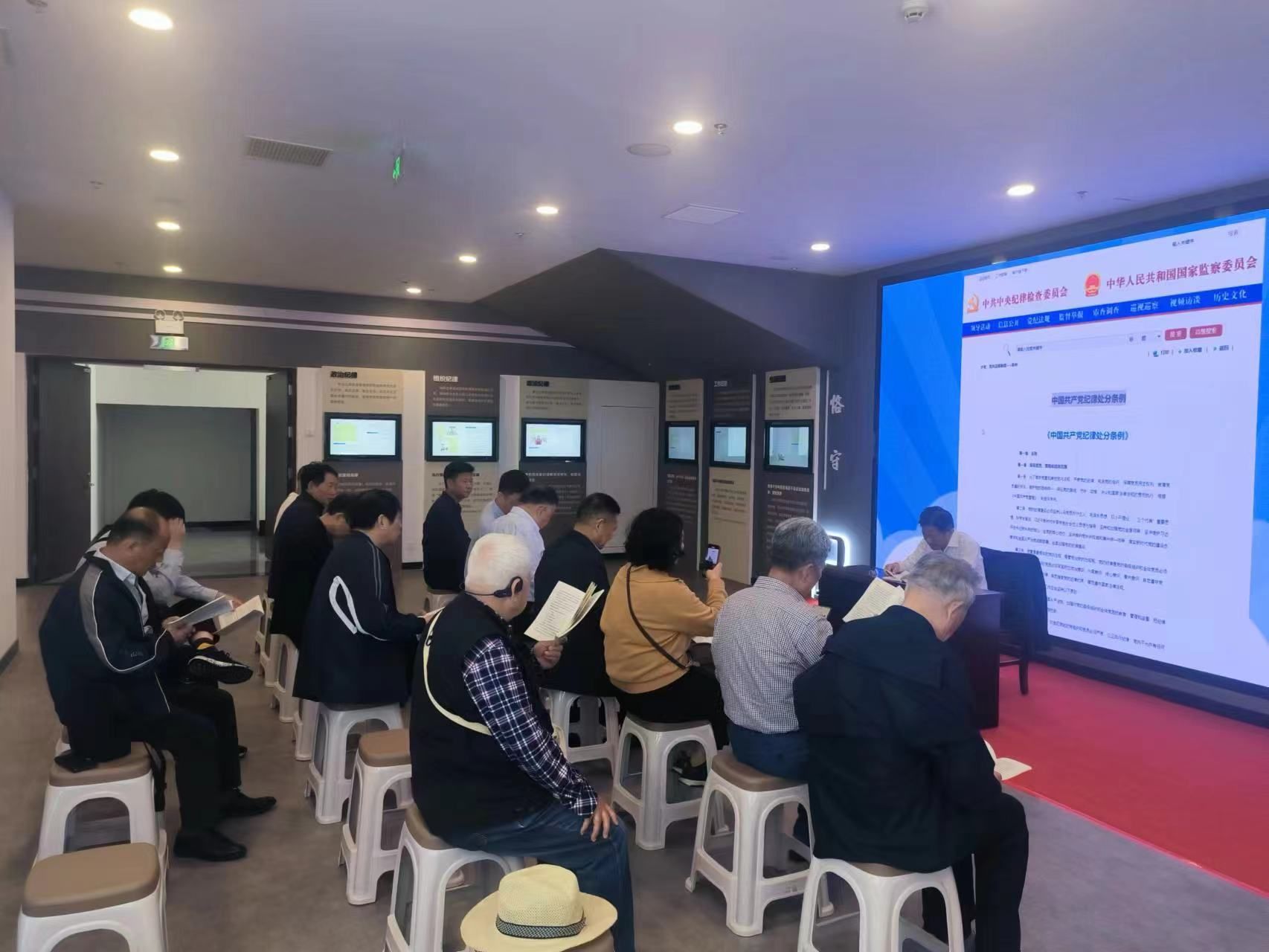 在烈士陵园陈列馆廉政展览厅,原后勤保障集团党委书记张建中带领大家一起学习《中国共产党纪律处分条例》部分条款及内容,他希望大家要坚持原原本本学,做到学纪、知纪、明纪、守纪,要永远听党话、跟党走,做到离岗不离党、退休不褪色、贡献正能力量。