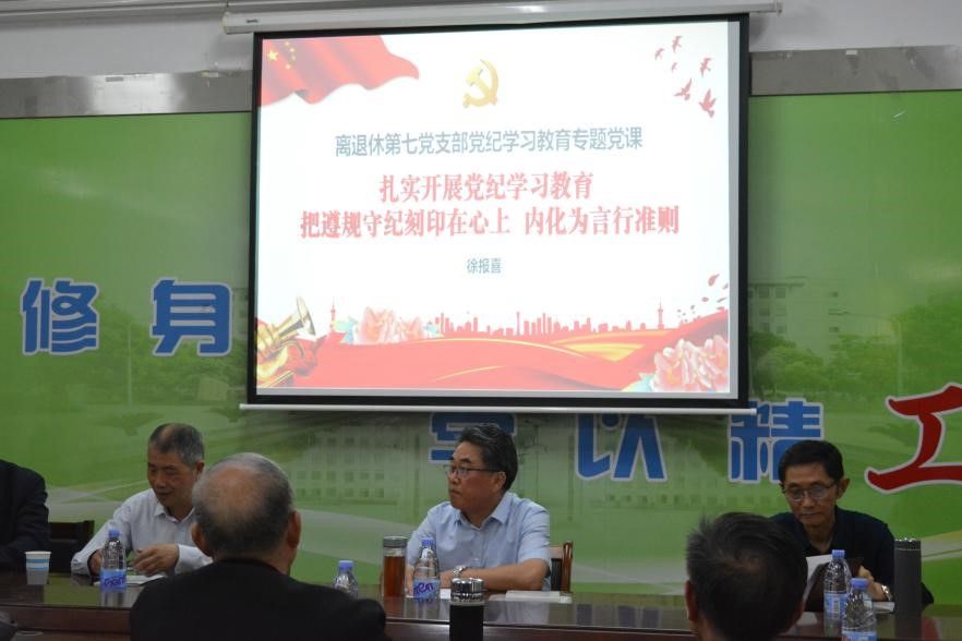 支部书记徐报喜首先传达了学校《关于在全校党员中开展党纪学习教育的实施方案》的通知,领学了《中国共产党纪律处分条例》中的部分内容。在此基础上,徐报喜为大家上了一堂《扎实开展党纪学习教育——把遵规守纪刻印在心上,内化为言行准则》专题党课。他指出,中央决定在全党开展党纪学习教育,就是聚焦解决一些党员干部对党规党纪不上心、不了解、不掌握等问题,搞清楚党的红线规矩是什么、弄明白能干什么、不能干什么,把遵规守纪刻印在心,内化为行,他还从学纪、知纪、明纪、守纪方面谈了自己的认识和感悟,退下来的老党员不能把自己定位为“一枚退休党员”,不在岗也无位子,离党纪党规约束很远。他希望大家要用党纪党规作为约束自己行为标准和遵循,明确能干什么,不能干什么,特别是当互联网也成为老同志生活中的新空间,老同志要认真领会《中国共产党纪律处分条例》对党员网络不当言行的明确规定,带头规范网络语言。
