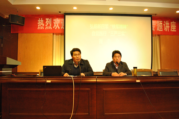 徐报喜的报告以《弘扬新四军“铁军精神”,自觉践行“三严三实”》为题。他从有“铁军”精神是盐工特色的办学育人之路;践行“三严三实”必将为盐工建设特色鲜明的应用型大学提供坚实的动力保证;践行“三严三实”是好老师努力的方向、学生成才成人的重要路径这个三个方面进行专题汇报。