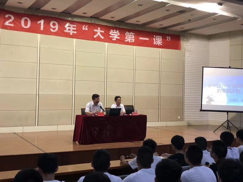 机械优集学院、材料学院、土木学院、环境学院、海生学院、信息学院和化生学院入学新生"大学第一课"先上"爱国第一课"。9月9日上午和下午机械优集等6学院和化生学院分别在北校区体育馆、化工楼报告厅举行"庆祝新中国诞辰70周年报告会,邀请学校关工委副主任、校“银龄理论宣讲团”(讲师团)成员徐报喜做了"讴歌伟大祖国、珍惜美好时代"为题的报告。徐主任在报告中深情回顾新中国70年破浪前行的发展历程,用翔实数据指标论述了中华民族迎来了由站起来到富起来再到强起来的历史性变化,以及新中国70年辉煌成就在中华民族发展和世界社会主义运动史上的划时代意义。徐主任还就新入校新生关切的职业规划、入党、培养阅读习愦和增进同学友谊等问题与大家做了交流,并深情回忆了自己在上世纪70年代读大学时的情景,寄语新生同学珍惜美好时代,用奋斗铸就真才实学,用奋斗成就未来和梦想。报告主题突出,内容丰富,深入浅出,具有较強的理论性、指导性和针对性,受到2700多名新生同学的热烈欢迎!