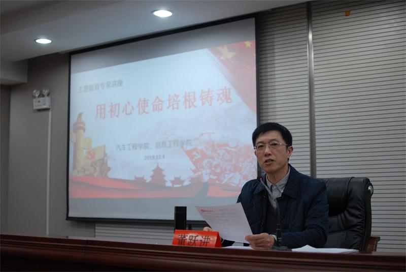12月4日下午,在南校区图书馆报告厅,原校党委常委、副校长、“银龄理论宣讲团”(讲师团)专家董跃进教授为学生作《用初心使命培根铸魂》专题报告。报告会由学院党总支书记张雷主持。汽车工程学院与信息工程学院学生党员、主要学生干部、积极分子代表240余人聆听了报告。