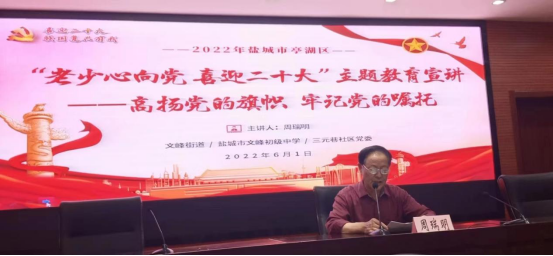 6月1日,校关工委原副主任、“校外辅导站(朝阳社区)”联络人周瑞明,受亭湖区文峰街道关工委邀请为文峰初中一年级500名左右师生作了"高扬党的旗帜,牢记党的嘱托"宣讲。