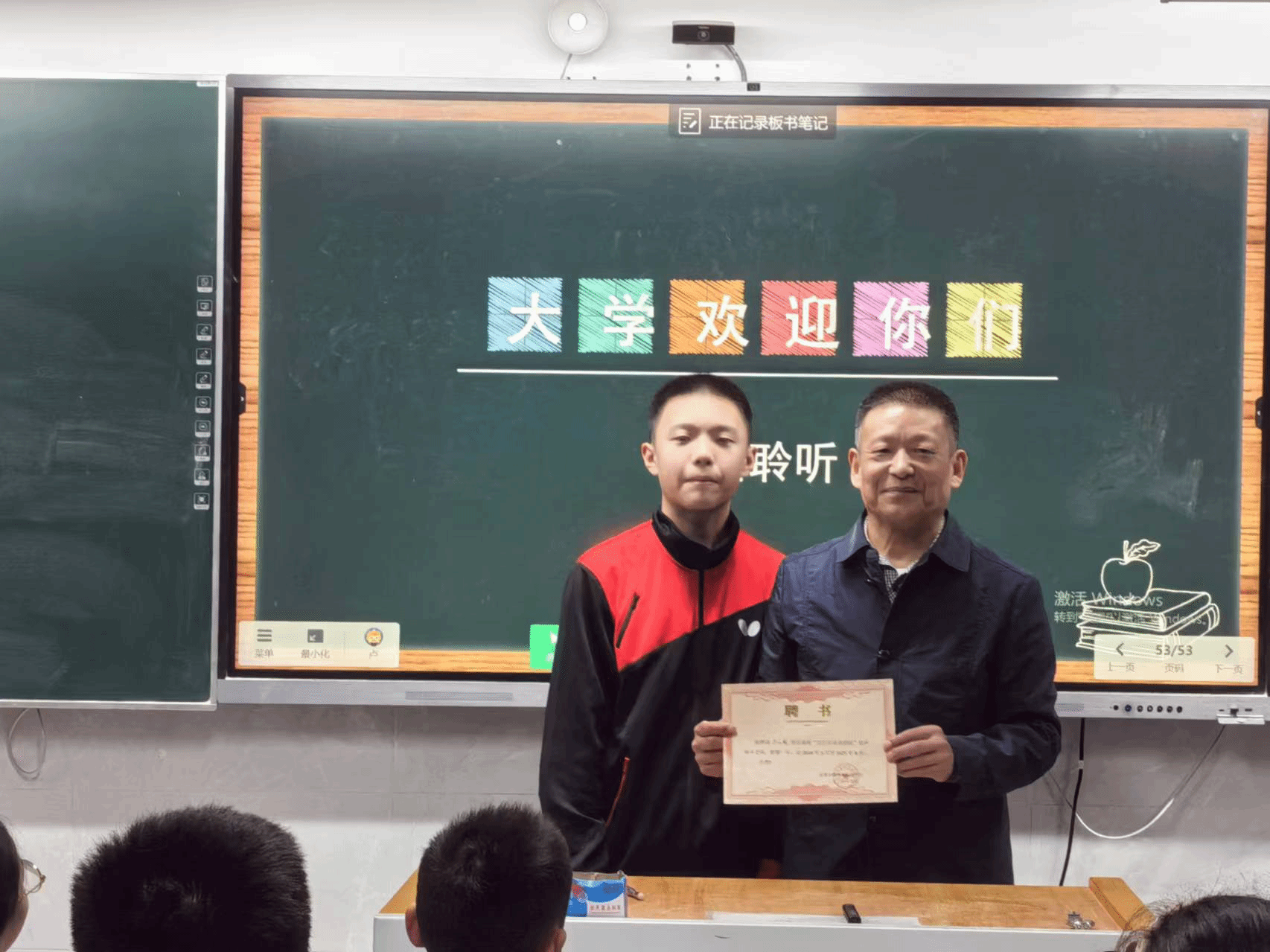 讲座结束后,鹿鸣路初中一年级卢乐俊主任代表学校向左元斌教授颁发“百行百业进校园”校外辅导老师聘书。