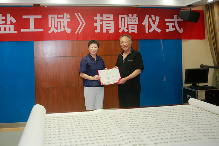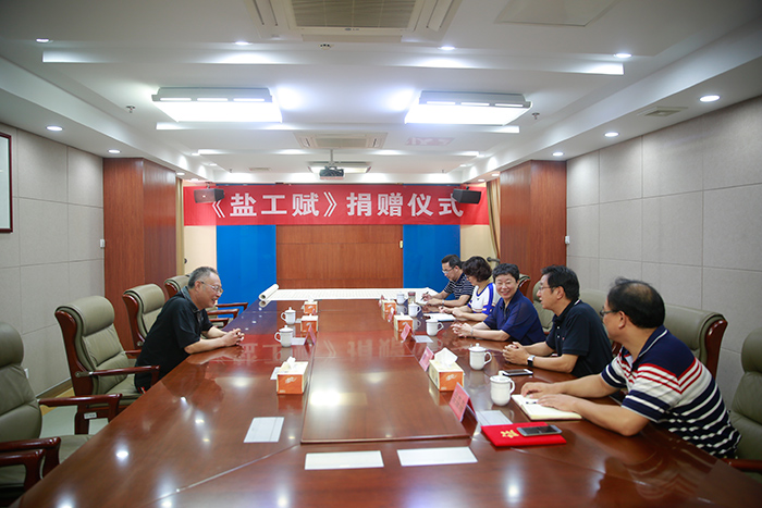 8月29日下午5:00,南校区行政楼830会议室里洋溢着欢乐的气氛。我校学报编辑部原主任、高教研究所原所长胡维定教授为祝贺学校办学60周年而创作的《盐工赋》捐赠仪式正在进行。校长叶美兰、党委副书记薛浩,校办、宣传部、离退处等部门负责同志参加了捐赠仪式。